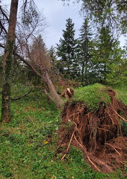 It’s Saturday afternoon. The storm that had been screaming outside all day has finally begun to subside – drifting off to expend its fury on Newfoundland where it will wash the town of Port aux Basques into the sea. We emerge from the house and examine the damage. Our greenhouse is miraculously undamaged but our solar panels are gone. We walk around some more and find them face down in the field next to the struts they stood on. We don’t know if they’re insured or not. In a few hours we will discover that our cat is sick but there are four trees down across our driveway and the wind and rain are still too high for me to safely cut us out with me being a green novice with the chainsaw. We decide to wait until the morning and reassess. By morning the cat is nearly dead but a neighbour, unaware that we were even home, brings his chainsaw and clears the path to the road. We cling desperately to the belief he just saved a life.