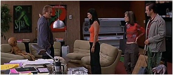 Set, as it is, on the set of the filming of Stab 3, Scream 3 is a film that revels in picking at the real / fake boundary that Scream 2 gestured toward. In an hilarious cameo, Carrie Fisher appears playing a receptionist who is regularly mistaken for Carrie Fisher. Gale is followed, throughout nearly the whole film, by Jennifer Jolie – an actress playing Gale in Stab 3. The second kill-scene in Scream 3 involves an actress complaining to the director that she is only in two scenes before her character becomes the victim of the second kill-scene in Stab 3. Her death is her second scene. The film is actively hostile to the idea of the fake and the real and wants to collapse reality and simulation into each other. This is used to good effect considering that Scream 3 picks up the feminist thread of the first film by approaching the original sin of the Scream universe as being Hollywood sexual exploitation of starlets. Possibly the single most damning scene of the Scream trilogy is when Gale interrogates producer John Milton: